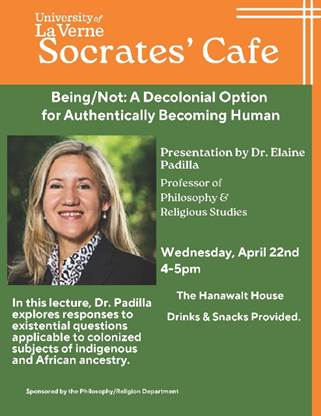 You are invited to join this semester’s Socrates’ Café, Being/Not: A Decolonial Option for Authentically Becoming Human on April 22nd, 4-5 pm in the Hanawalt House, featuring Dr. Elaine Padilla, Professor of Philosophy and Religious Studies. Dr. Padilla will discuss: responses to existential questions applicable to colonized subjects of indigenous and African ancestry.