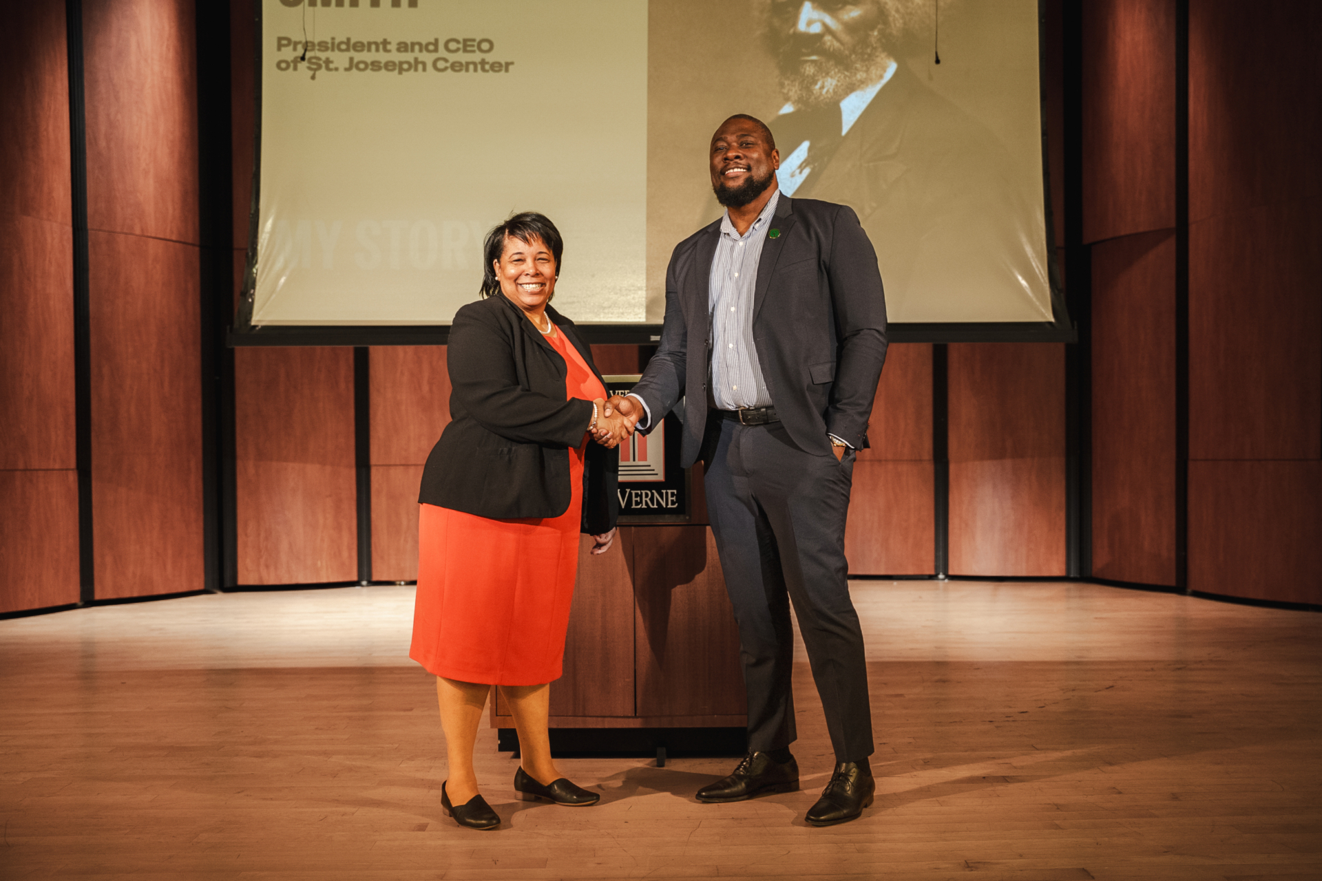 Shannon Mathews, dean of the ULV College of Arts and Sciences, greets Ryan J. Smith, president and CEO of St. Joseph Center. (ULV Photo/ Brandon Le)